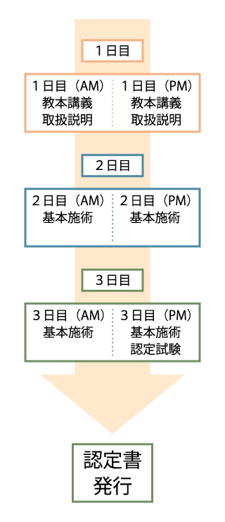 入会時研修は、延べ3日間で基本施術指導+病気に対してのケア方法等、受講者の目的に合わせて行います。
